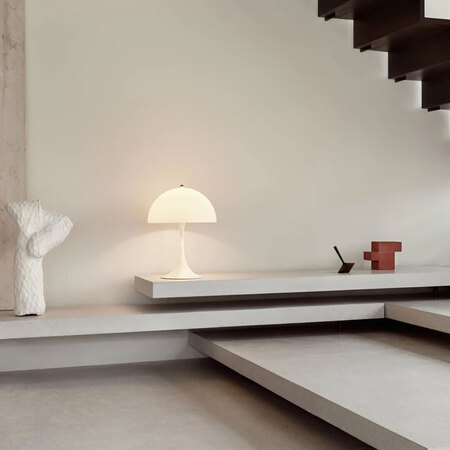 La "Panthella" diffuse une lumière ambiante douce et diffuse. L'abat-jour hémisphérique reflète la lumière vers le bas et le matériau permet de diffuser la majeure partie de la lumière de la surface de l'abat-jour dans la pièce.